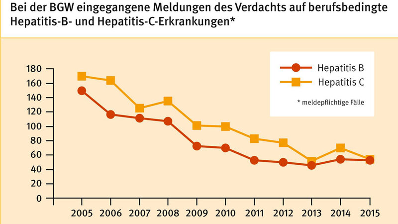 "Bei der Prävention von berufsbedingten blutübertragbaren Virushepatitiden sind durch vermehrte Impfungen und einen verbesserten Schutz vor Nadelstichverletzungen in den vergangenen Jahren große Erfolge erzielt worden", berichtet Prof. Dr. Albert Nienhaus, Leiter der Abteilung Arbeitsmedizin und Gesundheitswissenschaften der BGW. Die Zahl der bei der Berufsgenossenschaft eingegangenen meldepflichtigen Verdachtsanzeigen berufsbedingter Hepatitis-B-Erkrankungen sank zwischen 2005 und 2015 um rund 60 Prozent von 146 auf 57. Noch stärker ging die Meldung von Hepatitis-C-Erkrankungen an die BGW zurück: Hier fiel die Zahl der meldepflichtigen Verdachtsanzeigen von 168 im Jahr 2005 auf 53 im Jahr 2015.