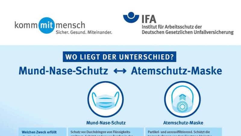 Um den Unterschied zwischen medizinischer Gesichtsmaske und Atemschutzmaske auf einen Blick deutlich zu machen, hat das Institut für Arbeitsschutz der Deutschen Gesetzlichen Unfallversicherung (IFA) eine Übersichtsgrafik erstellt.