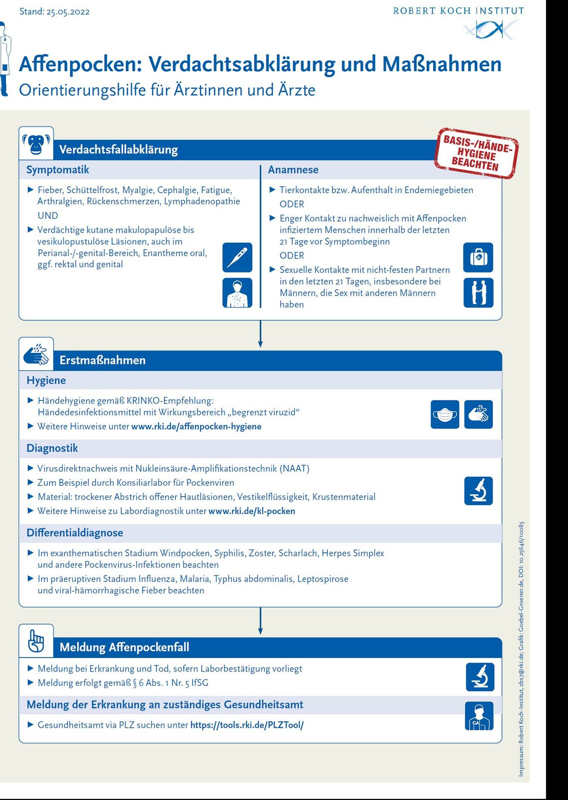 Patienten mit Affenpocken sind zu isolieren, bis ihr Ausschlag vollständig abgeheilt ist. Ein enger Kontakt mit immunsupprimierten Personen und Haustieren ist zu vermeiden. Es wird auch empfohlen, auf sexuelle Aktivitäten und engen Körperkontakt zu verzichten, bis der Ausschlag abgeheilt ist. Die meisten Fälle können ambulant versorgt werden. Enge Kontaktpersonen von MPX-Fällen sollten sich bis zu 21 Tage nach dem letzten Kontakt mit einem Fall selbst auf die Entwicklung von Symptomen überwachen. Mitarbeiter des Gesundheitswesens sollten beim Screening von Verdachtsfällen oder bei der Betreuung eines MPX-Falls geeignete PSA (Handschuhe, wasserfester Kittel, FFP2-Atemschutzmaske) tragen. Das Laborpersonal sollte auch Vorkehrungen treffen, um eine berufliche Exposition zu vermeiden [12]. Das RKI hat dazu eine Orientierungshilfe für Ärztinnen und Ärzte zusammenfasst (Abbildung 1) [11]. Aktuell ist eine heftige Diskussion entbrannt: Es wird dabei unterstellt, dass es sich um eine vermeintlich afrikanische Infektionskrankheit oder angeblich ausschließlich um eine Krankheit homosexueller, promiskuitiver Männer handele. Mit der Bebilderung von Patienten mit Affenpocken haben die Medien, vielleicht unwissentlich, dafür gesorgt, dass die Affenpocken nur von Individuen mit schwarzer Haut in Verbindung stehen; der jüngste Affenpockenausbruch wurde 1997 aus Westafrika berichtet, wo die meisten Menschen mit dunkler Hautfarbe an der Infektionskrankheit litten.