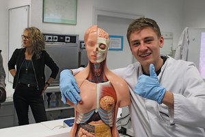 Im Histologielabor wurde den Besuchern erklärt, was Histologie bedeutet, sowie die Prozeduren im Labor von der Gewebeentnahme bis hin zur Entstehung der gefärbten Schnitte auf dem Objektträger vorgestellt. Es wurde von den Schülern gezeigt, wie das Gewebe im Paraffinblock geschnitten wird und wie sogenannte Schnellschnitte hergestellt werden. Mit Unterstützung der Fachlehrerin Regine Orlovsky hatten die Besucher weiterhin die Möglichkeit, sich unterschiedliche Gewebe (Gehirn, Niere, Dünndarm, Lymphknoten) im Mikroskop anzuschauen und somit mehr über die Strukturen des Aufbaus zu erfahren. Nebenbei wurde die Anatomie des Körpers anhand einer Modellpuppe erklärt.