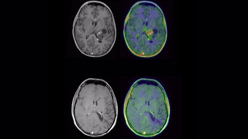 MRT eines Patienten mit Glioblastom vor (oben) und nach (unten) molekularer neuropathologischer Diagnostik und zielgerichteter Therapie. Die Wilhelm Sander-Therapieeinheit NeuroOnkologie ermöglicht neben einer gezielten Diagnostik auch die personalisierte Behandlung von Patienten mit Hirntumoren.