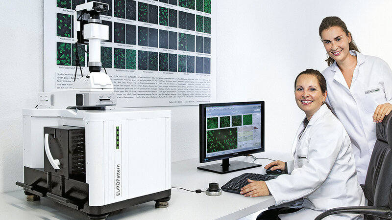 - Vollautomatische Auswertung monospezifischer Immunfluoreszenztests (RC-IIFT, EUROPLUS) sowie ANA, ANCA und CLIFT mittels EUROPattern.