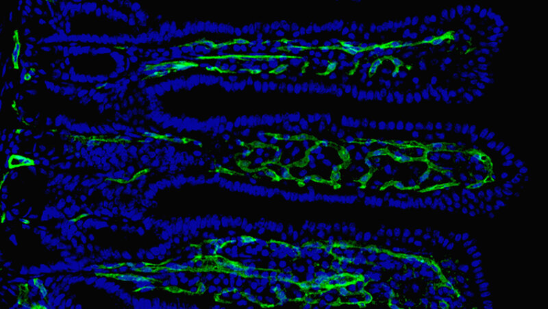 Forschende am CTH der Universitätsmedizin Mainz haben gezeigt, dass Darmbakterien die Darmbarriere schwächen und dadurch die Entstehung von Darmerkrankungen beeinflussen können. Das Bild zeigt eine mikroskopische Aufnahme von Dünndarmzotten mit Kapillargefäßen (grün) und Zellkernen (blau). © Universitätsmedizin Mainz / Christoph Reinhardt