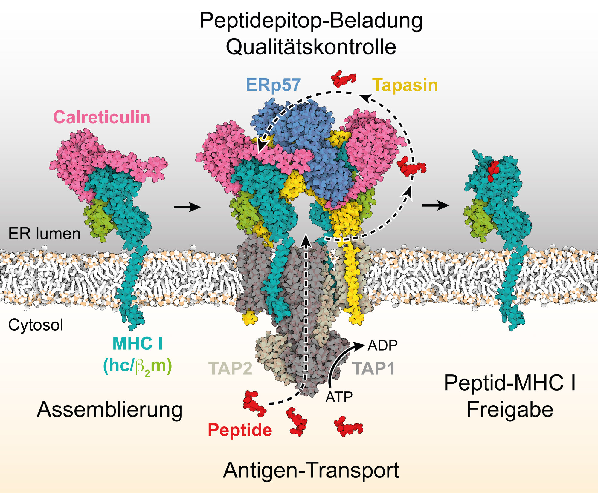 An dieser Stelle kommt die Antigenprozessierung ins Spiel. Dieser Vorgang lasse sich mit dem Erstellen eines Hinweisschildes vergleichen. Dieses werde in der Zelle, genauer im Endoplasmatischen Retikulum, „prozessiert“ oder zusammengefügt. Dabei kommen spezielle Moleküle zum Einsatz, die MHC Klasse I-Moleküle. Sie werden im Peptidladekomplex (peptide loading complex, PLC), einer molekularen Maschine, mit Informationen über das eingedrungene Virus beladen. Diese Informationen bestehen laut Forscherinnen und Forschern aus Peptiden, Bruchstücken des körperfremden Proteins. Diese Bruchstücke enthalten auch Epitope, jene Molekülabschnitte, die die spezifische Immunantwort auslösen. Bei der Beladung bilde sich also ein MHC I-Peptidepitop-Komplex: das Hinweisschild. Dieses werde zur Zelloberfläche transportiert und dort den T-Killerzellen präsentiert. An dem Prozess wesentlich beteiligt seien auch die Chaperone, spezielle Begleitproteine, die in Zellen die korrekte Faltung kompliziert aufgebauter Proteine lenken.
