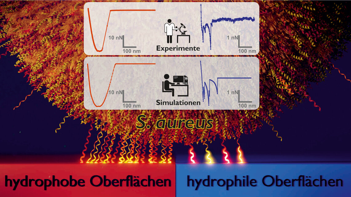 Um diese experimentellen Ergebnisse zu verstehen, wurden in der Arbeitsgruppe von Ludger Santen, Professor für theoretische Physik der Saar-Universität, Monte-Carlo-Simulationen durchgeführt, mit deren Hilfe die Dynamik komplexer Systeme modelliert werden kann. Das Modell beschreibt das Bakterium als starre Kugel und die Zellwandmoleküle an der Oberfläche als kleine Federchen. „Für die richtige Beschreibung der Experimente ist es entscheidender, die Zufallskomponente bei der Bindung an der Oberfläche zu betrachten, als die Komplexität des theoretischen Modells zu erhöhen. Wir haben dabei herausgefunden, warum sich die Bakterien je nach Oberfläche so unterschiedlich verhalten: Auf wasserabweisenden Materialien haften sehr viele Zellwandmoleküle, was insgesamt zu einer starken Haftung und einer gleichmäßig glatten Form der Kraft-Distanz-Kurven führt“, erläutert Ludger Santen. Auf den hydrophilen Oberflächen hingegen blieben nur wenige Moleküle hängen, die Zelle haftete folglich schlechter und die Kurvenform wurde weniger gleichmäßig. „Diese gezackte Kurvenform wird verursacht durch wenige, einzelne Zellwandmoleküle, die sich einzeln von der Oberfläche ablösen. Dadurch können die Bakterien als Ganzes schlechter an der hydrophilen Materialoberfläche anhaften“, so Erik Maikranz, der die Simulationen im Rahmen seiner Doktorarbeit durchgeführt hat.