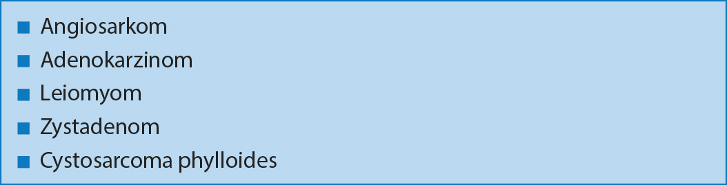 Nach Entzündungen der Prostata oder bei Obliteration durch einen tumorösen Prozess, z.B. der Prostata, sind sekundäre Zysten bekannt. So kann bei Störung der Prostatasekretion die Konditionierung der Urethra für die Spermienpassage eingeschränkt sein und sekundär ein Aufstau der Samenblasen entstehen (1). Auch primäre benigne und maligne Tumoren der Samenblasen sind zu differenzieren (Tabelle 1).