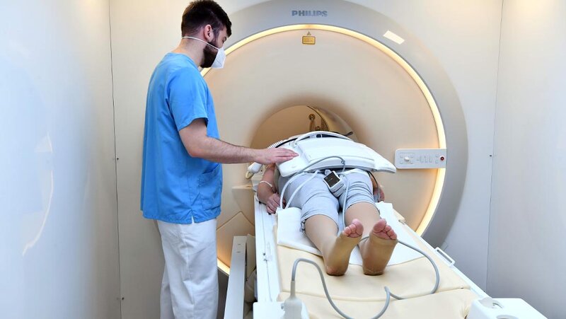 Eine Patientin wird im „HerzCheck“-MRT-Trailer untersucht © Joachim Kloock