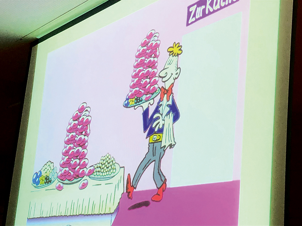 Der Samstag stand ganz im Zeichen der mikroskopischen Morphologie. Dr. med. Heinz Diem verstand es, alle 180 Teilnehmer in den Bann der Morphologie zu ziehen. Er hat anschaulich gezeigt, wie der Standardlymphozyt aussieht, bis hin zu neoplastisch veränderten Zellen, sowohl im peripheren Ausstrich wie auch im KM-Präparat. Ein ganz besonderes Schmankerl waren die Comiczeichnungen der Blutzellbildung. Sie wurden so dargestellt, als würden die Zellen in einer Küche (Knochenmark) produziert und auf den Tisch (peripheres Blut) gebracht (wie in Abbildung 2 zu sehen). Während der gesamten Veranstaltung war der DVTA mit einem Stand vertreten und wir konnten auf Fragen professionelle Antworten geben.
