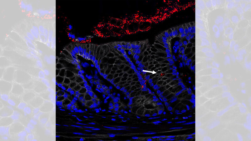 Querschnitt eines entzündeten Dickdarms (Mausmodell): Die Zellkerne sind blau, die Zellmembranen weiß eingefärbt. Rot markiert sind die Bakterien, die das gesamte Mikrobiom darstellen. Der Pfeil zeigt auf die Bakterien, die in die Krypten – die Vertiefungen der Darmschleimhaut – gelangt sind. In gesundem Zustand ist dieser Bereich vor Bakterien geschützt. Sigal/Charité
