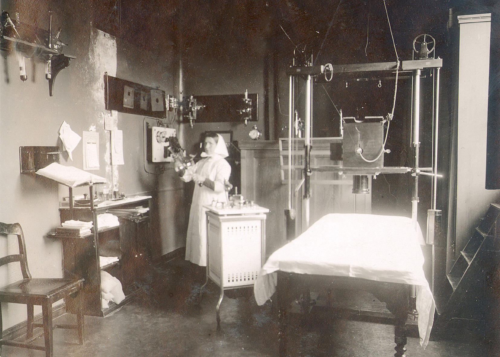 Abb. 4: Schwester mit Röhre im Röntgenkabinett um 1910. Links an der Wand befindet sich der Halter für die unterschiedlich harten Röhren. | © Archiv Deutsches Röntgen-Museum. Mit freundlicher Genehmigung