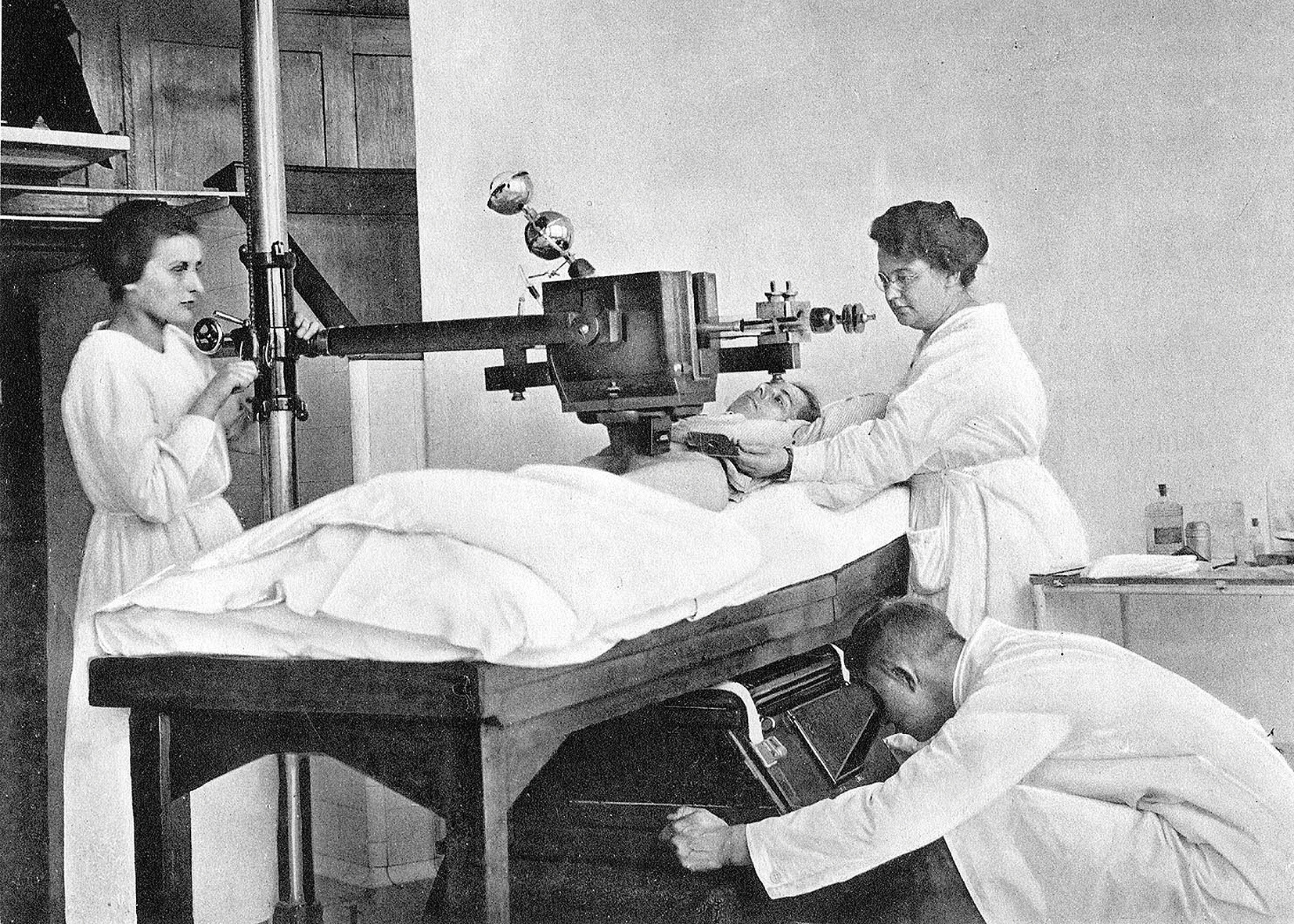 Neben der Untersuchung wurden auch Patienten mit den gleichen Apparaturen zu Therapiezwecken bestrahlt. Ohne die damalige genaue Kenntnis von Dosiswerten wurde zum Beispiel ein Schulterekzem drei- bis viermal wöchentlich jeweils zwölf Minuten mit einer mittelweichen bis harten Röhre im Abstand von 35 Zentimetern bestrahlt. Filter und Röhrenblenden kamen anfangs noch nicht zur Anwendung. Das Feld wurde mit einem Bleigummituch abgegrenzt. Zur Bestimmung der Dosis wurden Plättchen aus Bariumplatinzyanür mitbestrahlt, die unter zunehmender Röntgenbestrahlung ihren Farbton ändern. Filter aus Aluminiumblech fanden ab circa 1912 Anwendung. Ein Uterusmyom wurde circa 40 Minuten bestrahlt. Dabei kam es häufig vor, dass die Röhren während der Bestrahlung zu hart wurden und ausgetauscht werden mussten [11]. Röntgenschwestern waren hier auch dafür verantwortlich, dass unruhige Patienten nicht aus Versehen die meist noch unzureichend oder gar nicht isolierten Hochspannungszuführungen berührten und dabei vielleicht einen tödlichen elektrischen Schlag erhalten hätten.