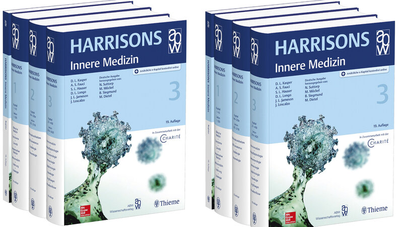 Es sind wieder drei Bände plus Register geworden. Allerdings sind etliche Kapitel nur online abrufbar (kostenlos). Einige Bereiche wurden neu strukturiert wie zum Beispiel Teil 16 (Endokrinologie und Stoffwechsel). Hauptherausgeber der deutschen Ausgabe sind Prof. Norbert Suttorp, Prof. Martin Möckel, Prof. Britta Siegmund und Prof. Manfred Dietel. Auch die 19. Auflage wurde wieder in Zusammenarbeit mit der Charité herausgegeben. Die Kooperation mit Thieme spiegelt sich inzwischen auch in den Farben des Umschlags wider. Das unentbehrliche medizinische Nachschlagewerk kommt auf insgesamt über 4.500 Seiten und 2.130 Abbildungen. Es gilt zu Recht als Referenzwerk der Inneren Medizin. Der Harrisons ist aber bei Weitem nicht nur für internistisch Arbeitende zu empfehlen, sondern durch die (immer wichtiger werdende) Interdisziplinarität auch weit darüber hinaus. Zahlreiche Nachbargebiete wie zum Beispiel die Neurologie oder Dermatologie wurden miteinbezogen. Der Schwerpunkt der Infektiologie ist gerade vor dem Hintergrund der zunehmenden Migration wichtig. Viele bisher wenig beachtete Krankheiten finden inzwischen den Weg nach Deutschland. Der Anspruch, das Werk nicht nur aus dem Englischen zu übersetzen, sondern auf europäische und deutsche Verhältnisse anzupassen, ist abermals gelungen. Durch das Kenntlichmachen der Abweichungen zum Original ergibt sich ein schneller Überblick. Didaktisch ist der Harrisons gut aufgebaut. Farbige Markierungen sorgen für gute Übersichtlichkeit. Ergänzende Videodateien sind abrufbar. Aufgrund der Fülle an Information ist der Preis von 289,95 Euro zu relativieren.