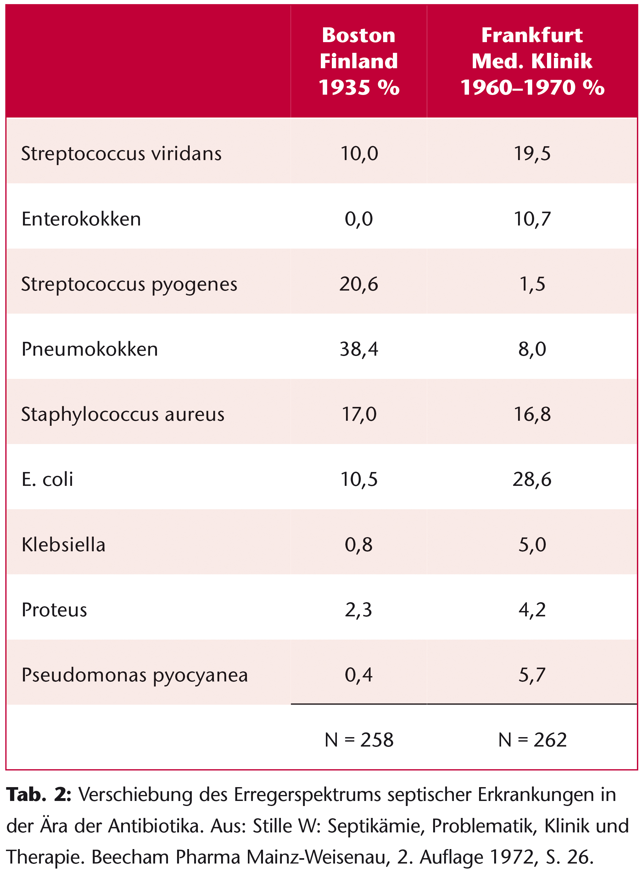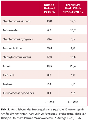 Tabelle 2 gibt dazu einen imposanten Überblick [43, 44]. Spitzy beschreibt den Hospitalismus durch gramnegative Erreger als Selektion der ubiquitären Patientenflora nach ihren resistenten Stämmen und Mutanten. Infolge der hohen Empfänglichkeit von schwerkranken Patienten (Polytraumen, Immunsuppression, komplizierte Operationen, Tracheotomie, Katheter sind ätiologische Komplikationsmöglichkeiten) werden die sonst harmlosen Keime der körpereigenen Mikroflora zu pathogenen Erregern, die als selektierte Opportunisten während des Krankenhausaufenthaltes zunehmen und sozusagen auf ihre „Chance“ warten, als Sepsiserreger auftreten zu können [42].