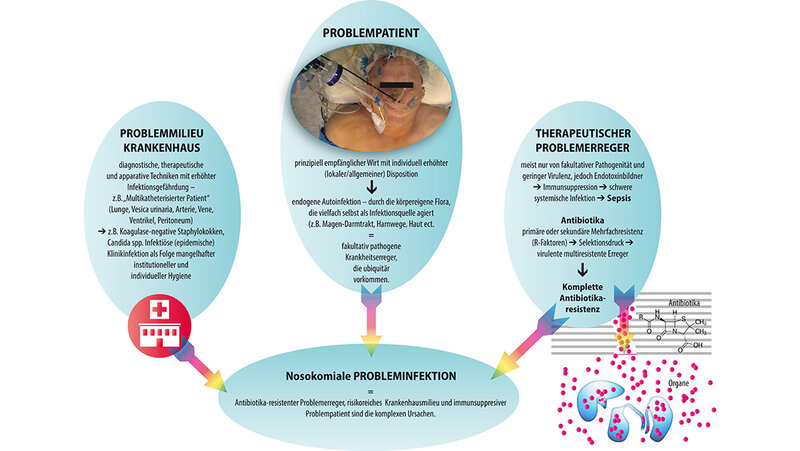 Der inzwischen emeritierte Klinikhygieniker Prof. Dr. med. Franz Daschner (*1940) hat zwischen 1970 bis Anfang der 2000er-Jahre immer wieder auf die Misere der Klinikinfektionen durch eigene Studien hingewiesen: 1976 schrieb Daschner dazu: „Circa 5 Prozent aller Patienten erkranken an einer nosokomialen, das heißt im Krankenhaus erworbenen Infektion. Eine der Hauptursachen dafür sind therapeutische Maßnahmen, die zu einer erhöhten Keimexposition des Patienten (verunreinigte Beatmungsgeräte, Venen-, Blasenkatheter und so weiter) und zu einer erhöhten Disposition der Patienten durch Verminderung der körpereigenen Abwehr (Zytostatika-Therapie, Cortison, Bestrahlung, Operationen und so weiter) führen. Kreuzinfektionen werden vorwiegend durch die Hände von Ärzten und Pflegepersonal übertragen. Die Erfassung, Verhütung und Bekämpfung von Hospitalinfektionen durch speziell geschultes Personal (Krankenhausepidemiologen, Hygienefachschwestern, Klinikhygienekommissionen) ist dringend erforderlich und allein schon volkswirtschaftlich gerechtfertigt. In den Vereinigten Staaten müssen pro Jahr mindestens 1,13 Milliarden Dollar für die Diagnostik und Behandlung krankenhauserworbener Infektionen ausgegeben werden, Arztkosten und Kosten für Rehabilitation und Arbeitsausfall noch nicht eingerechnet“ [47, 48] (inzwischen gibt es eine Fülle an Studien dazu, die zu Besorgnis Anlass geben; Anm. d. Verf.). Auch Prof. Dr. med. Peter Naumann (1922–2004), Direktor des Instituts für Medizinische Mikrobiologie und Virologie der Heinrich-Heine-Universität Düsseldorf, der sich seinerzeit für nationale und internationale objektive Bewertungskriterien für die bakteriologische Resistenzbestimmung einsetzte und somit für eine bessere Übereinstimmung bei der Beurteilung der Erregersensibilität für eine rationale Therapie beitrug, definierte im Jahre 1981 die Ursachentrias der Hospitalinfektion [50] (siehe Abbildung 6).
