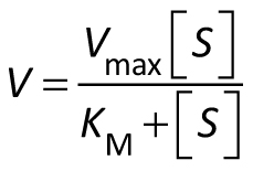 Die Geschwindigkeit einer Enzymreaktion hängt von der Konzentration der Reaktionsteilnehmer ab: Enzym E und Substrat S bilden einen spezifischen Komplex ES („Schlüssel-Schloss-Prinzip“ nach Emil Fischer). Die Geschwindigkeit V ist von der S-Konzentration [S] abhängig und erreicht bei S-Sättigung des Enzyms die maximale Geschwindigkeit Vmax . Bestimmend ist der Zerfall von ES zu E und Produkt [P], nur im Fließgleichgewicht sind Bildungs- und Zerfallsgeschwindigkeit gleich groß.