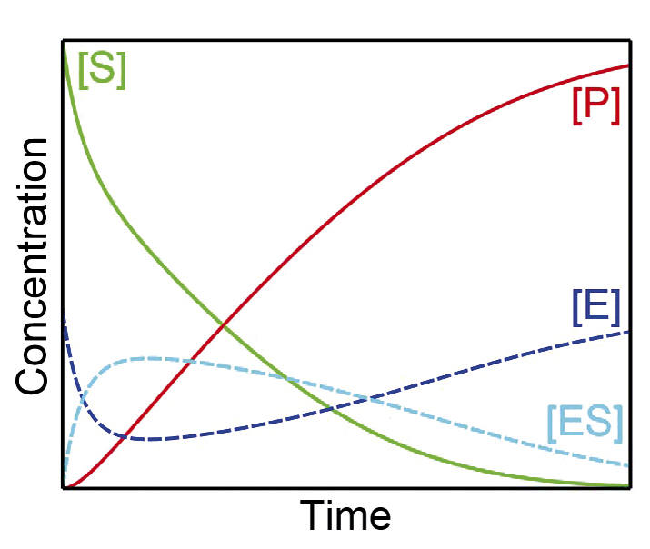 Abb. 2: Änderungen der Konzentrationen über die Zeit für Enzym E, Substrat S, Komplex ES und Produkt P | © U+003F, own work, CC0