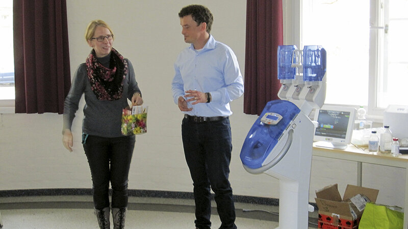 Der Hintergrund war die Einweisung an einem modernen Kontrastmittelinjektor der Firma ulrich medical. Das Gerät, welches ebenso gut auf der „Enterprise“ stehen könnte, zeigte sich gleich von seiner besten Seite, indem es in einer blauen, speziell entwickelten 250 kg schweren Transportbox angeliefert wurde. „Sicherheitsbestimmungen“, erklärte Rupprecht, der im Außendienst für ulrich medical arbeitet.