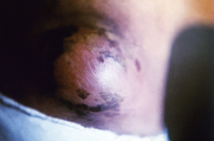 Nahaufnahme eines Bubos oder geschwollenen Lymphknotens, im Falle der Bubonenpest, fotografiert auf der Haut eines vietnamesischen Patienten | © CDC/Dr. H. G. Scott