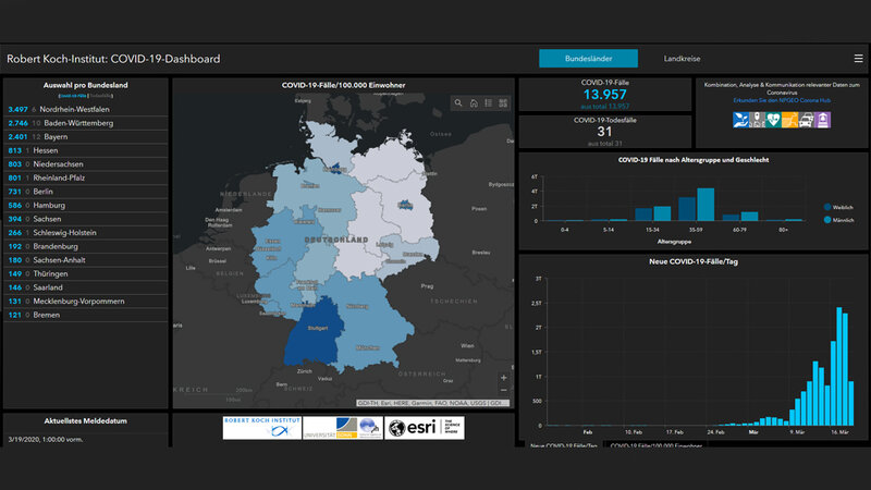 Auch das RKI hat jetzt ein Dashboard zu COVID-19 initiiert. Es ist unter experience.arcgis.com/experience/478220a4c454480e823b17327b2bf1d4 abrufbar. Es geht auf die Bundesländer und Landkreise ein.