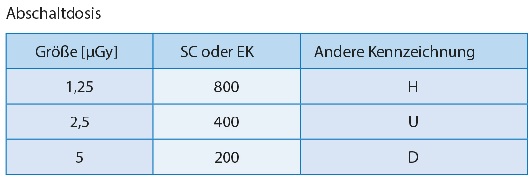 Die vorprogrammierte Abschaltdosis wird dem Anwender auf verschiedene Weise angezeigt (je nach Gerät/Hersteller): direkt als Größe (siehe Tabelle 1, Spalte 1, als SC oder EK (siehe Tabelle 1, Spalte 2) oder in Form der Kennzeichnung H (für hochverstärkend), U (für universal), D (für detailreich) (siehe Tabelle 1, Spalte 3)).