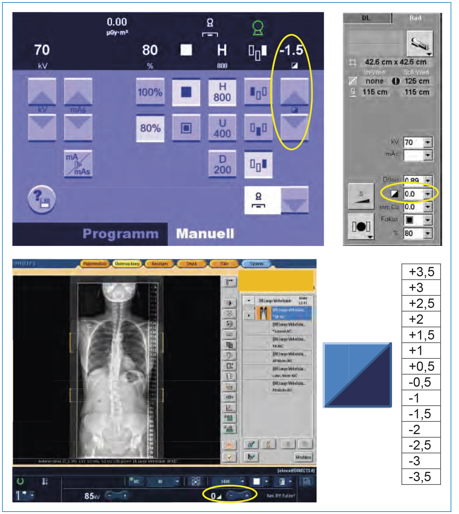 ■ Durch gegenläufige Anwahl von kV und mAs um die gleiche Anzahl von BP können gleiche Detektordosen erzeugt werden.