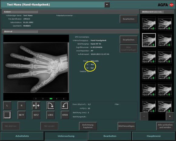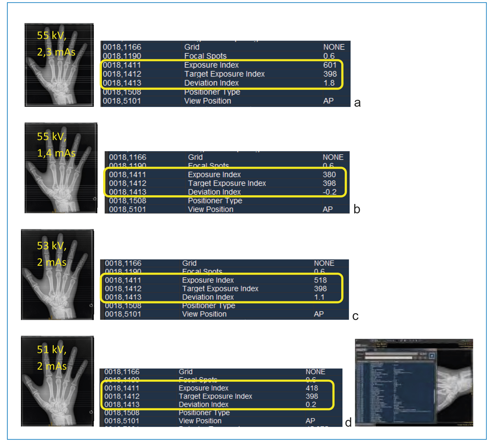 Abb. 6 zeigt Aufnahmen eines Handphantoms. Sie wurden unter sonst gleichen Aufnahmebedingungen mit unterschiedlichen Expositionswerten angefertigt. Neben jeder Aufnahme findet sich ein Auszug aus den dazugehörigen DICOM Header-Daten. Der Zielwert EIT(target exposure index) liegt für dieses Organ bei dem Wert ‚398‘. Zunächst lässt sich die automatische Berechnung des DI nachvollziehen, z.B. in Beispiel a: