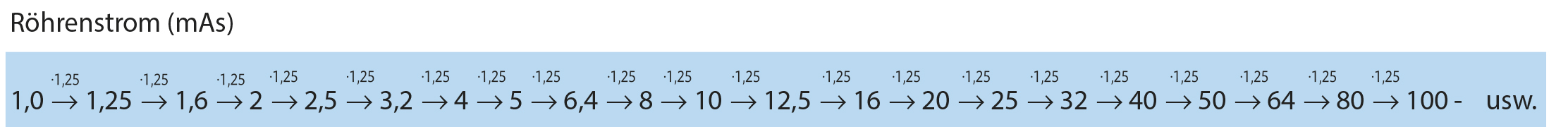 ■ Die Stufung der mAs- und kV-Skalen erfolgt in 1-BP- (R‘10-Skala) bzw. ½-BP-Schritten (R’20-Skala).