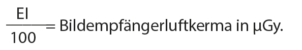 Der Dosisindikator stellt das Hilfsmittel zur Einschätzung der Detektordosis dar. Derzeit sind die meisten Dosisindikatoren noch herstellerspezifisch und müssen auf verschiedene Weise interpretiert werden. Um diesem Problem zu begegnen, wurden auf Grundlage einer entsprechenden europäischen Norm die Anforderungen an einen einheitlichen Dosisindikator in der DIN EN 62494-1 festgeschrieben. Danach gilt für diesen Dosisindikator EI unter Kalibrierbedingungen folgende Beziehung: