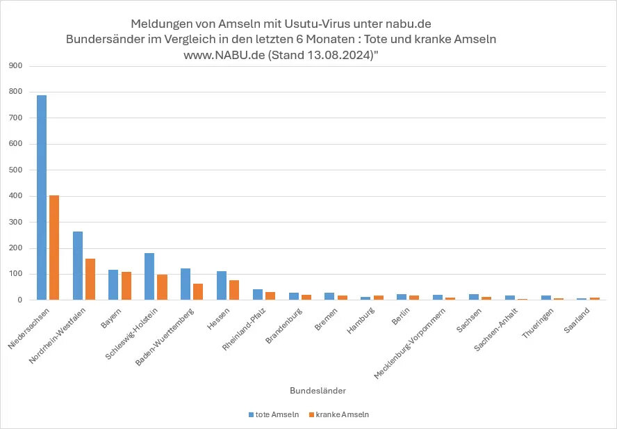 Sowohl die Einsendungen als auch die Meldungen stammen aus dem gesamten Bundesgebiet. Besonderer Schwerpunkt scheint diesmal Niedersachsen zu sein, wo aktuell auch ein Schwerpunkt der ausgebrochenen Blauzungenkrankheit ist, die ebenfalls durch Mücken (Gnitzen) übertragen wird. Von dort kamen laut NABU in der ersten Jahreshälfte 6-mal mehr Meldungen als im Vergleichszeitraum für 2023. Als Ursache vermuten BNITM und NABU, dass das Usutu-Virus (USUV) derzeit noch stärker zirkuliert als sonst ohnehin während der Stechmückensaison zwischen Mai und September. Der warme und vor allem feuchte Sommer habe die starke Aktivität des Virus in Stechmücken begünstigt.