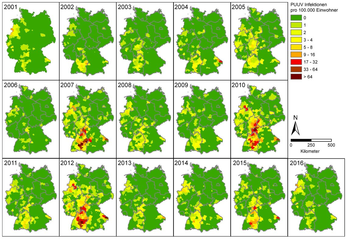 Belastbare Daten über die Häufigkeit der Hanta-Virus-Infektionen sind in Deutschland seit der Einführung der Meldepflicht im Jahr 2001 verfügbar. Besonders viele Puumala-Virus-Infektionen treten in Baden-Württemberg und angrenzenden Gebieten in Bayern und Nordrhein-Westfalen auf. In Nordostdeutschland gibt es dagegen wenige PUUV-Virus-Fälle. In großen Städten und Ballungsgebieten (Berlin, Stuttgart, Bonn) ist die Zahl der PUUV-Infektionen pro 100.000 Einwohner tendenziell höher als in ländlichen Gebieten. Während die räumlichen Muster über die letzten 15 Jahre ähnlich geblieben sind, gab es starke zeitliche Schwankungen: So war die Zahl der gemeldeten PUUV-Infektionen in den Jahren 2007, 2010 und 2012 besonders hoch.