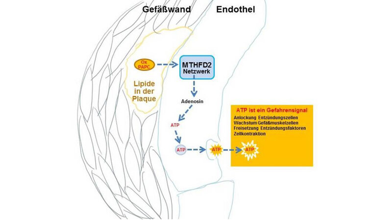 Kern der Beobachtung ist, dass MTHFD2 an der Spitze einer Stressreaktion des Endothels steht. Diese endet in der Freisetzung von Botenstoffen, besonders Adenosintriphosphat (ATP), um einen Gefahrenzustand zu signalisieren. MTHFD2 wird dabei benötigt, um zunächst die Aminosäure Glycin zu synthetisieren, die dann wiederum für die Bildung von Adenosin benötigt wird, dem Ausgangsprodukt von ATP. ATP, das innerhalb der Zelle als Energiequelle benutzt wird, erzeugt außerhalb der Zelle eine entzündliche Reaktion und löst damit adäquate Reaktionen auf einen Gefahrenzustand aus. „Die Entzündung befördert das Fortschreiten der Arteriosklerose maßgeblich. MTHFD2 könnte also ein wichtiger Ansatzpunkt für neue pharmazeutische Therapien werden, da es an der Spitze der endothelialen Reaktionskette steht“, erklärt Juliane Hitzel den Nutzen der Entdeckung für die medizinische Behandlung. Die Biochemikerin hat als Doktorandin und Erstautorin das Projekt maßgeblich durchgeführt. (Uniklinik Frankfurt, red)