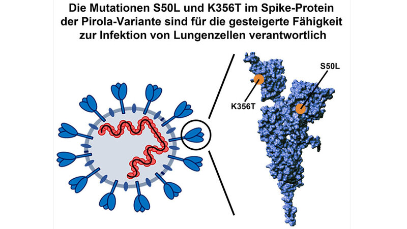 Das Spike-Protein der stark mutierten Pirola-Variante besitzt zwei wichtige Mutationen, S50L und K356T, welche die Infektion von Lungenzellen verbessern. © Markus Hoffmann/Deutsches Primatenzentrum GmbH – Leibniz-Institut für Primatenforschung