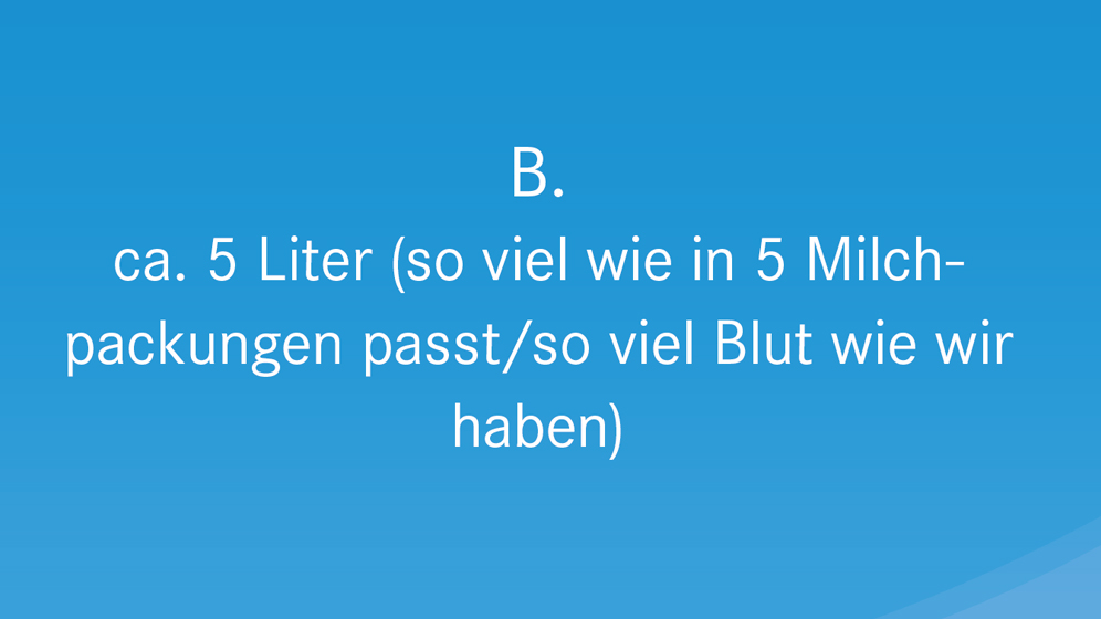 Richtig ist Antwort B ca. 5 Liter (so viel wie in 5 Milchpackungen passt/so viel Blut wie wir