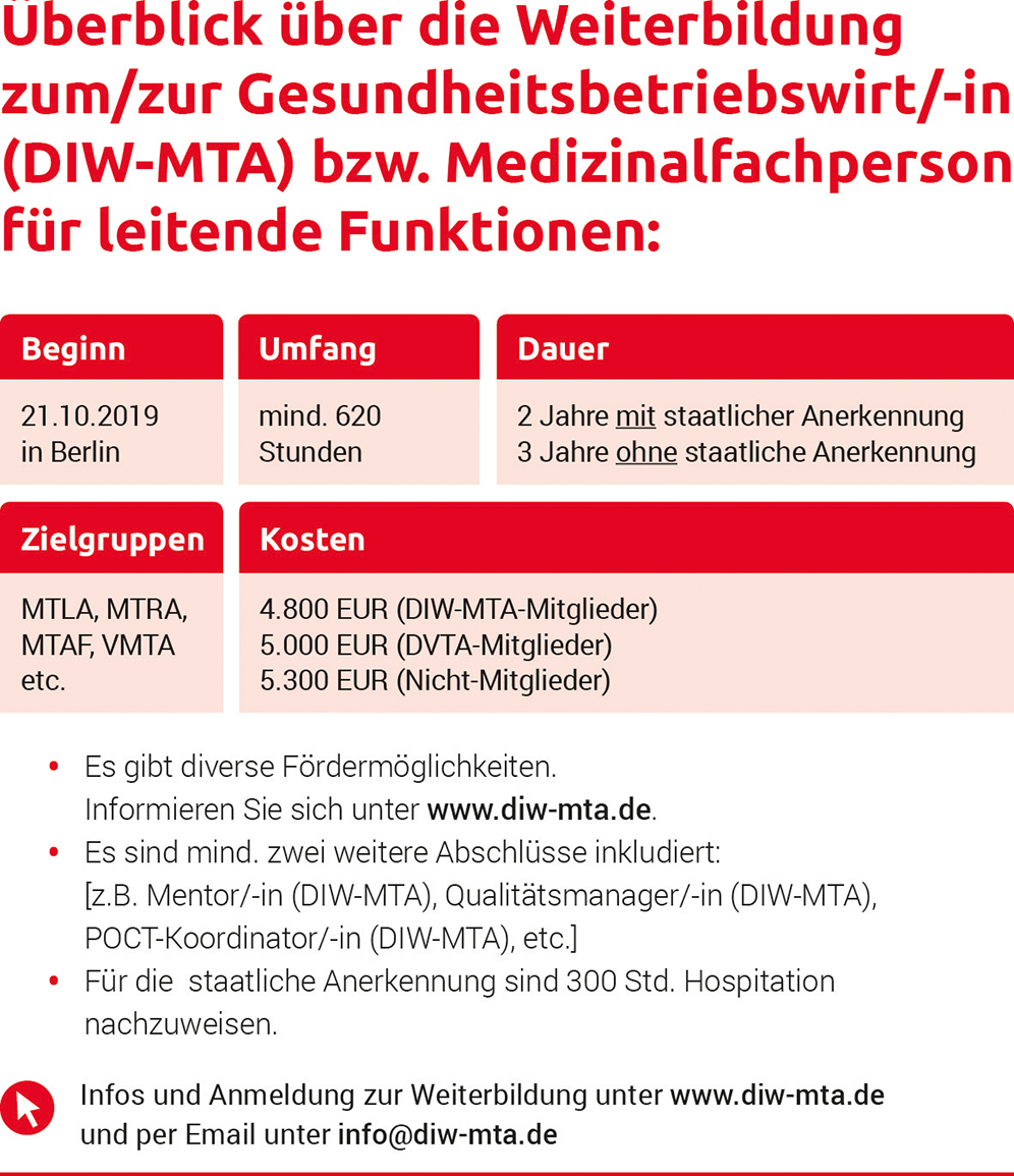 Am 21. Oktober 2019 wird durch das DIW-MTA in Berlin zum mittlerweile achten Mal die berufsbegleitende Weiterbildung „Medizinalfachpersonen für leitende Funktionen“/ „Gesundheitsbetriebswirtschaft“ starten, die der Berufsgruppe der MTA, aber auch anderen medizinisch qualifizierten Berufsgruppen, als verlässliche Möglichkeit dient, das erforderliche Handwerkszeug für die Übernahme von Leitungsaufgaben zu erwerben. Diese Weiterbildung ergänzt das Qualifikationsprofil der MTA im betriebswirtschaftlichen Feld. Die Teilnehmer/-innen lernen, betriebliche Handlungs-, Gestaltungs- und Entscheidungsspielräume zu nutzen, arbeits- und sozialrechtliche Rahmenbedingungen zu verstehen sowie Budget- und Personalverantwortung zu übernehmen. Darüber hinaus wissen die Absolventen/-innen die Methoden der Qualitätsentwicklung und -sicherung anzuwenden und zu bewerten, Kooperations- und Teamstrukturen zu analysieren, Personalentwicklungsinstrumente einzusetzen, vorhandene Tätigkeitsspielräume zu nutzen oder zu erweitern und daraus Konsequenzen für das eigene soziale Handeln abzuleiten.