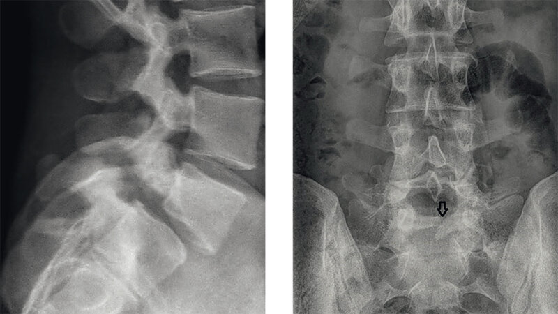 Abb. 1.1: Seitliche Röntgenaufnahme der LWS (Bildausschnitt) mit Spondylolyse und -listhese °2 von LWK 5 | Abb. 1.2: a.p.-Aufnahme der LWS (Bildausschnitt), zusätzlich Nachweis eines unvollständigen Bogenschlusses bei SWK 1 (Pfeil), entsprechend einer Spina bifida occulta Für alle: © H.-J. Thiel