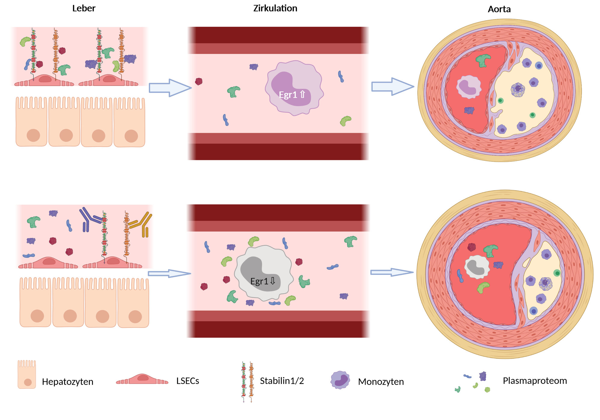 „Der starke Einfluss von Lebersinusoidendothelzellen über ihre Scavenger-Rezeptoren auf entfernte Organe ist bisher kaum beschrieben und ist ein recht neuartiges Konzept“, berichtet Dr. med. Thomas Leibing aus der Arbeitsgruppe von Professor Géraud und einer der beiden Erstautoren der Arbeit. „Nun konnten wir zeigen, dass eine Hemmung von Stabilin-1 und Stabilin-2 über Immunzellmodulation die Atheroskleroseentstehung hemmt.“ Mittels Einzelzell-RNA-Sequenzierung wiesen die Wissenschaftler nach, dass der Transkriptionsfaktor Egr1 durch Plasma von Mäusen ohne Stabilin unterdrückt wird. In vivo fanden sie eine verminderte Expression von Egr1 in zirkulierenden Monozyten.