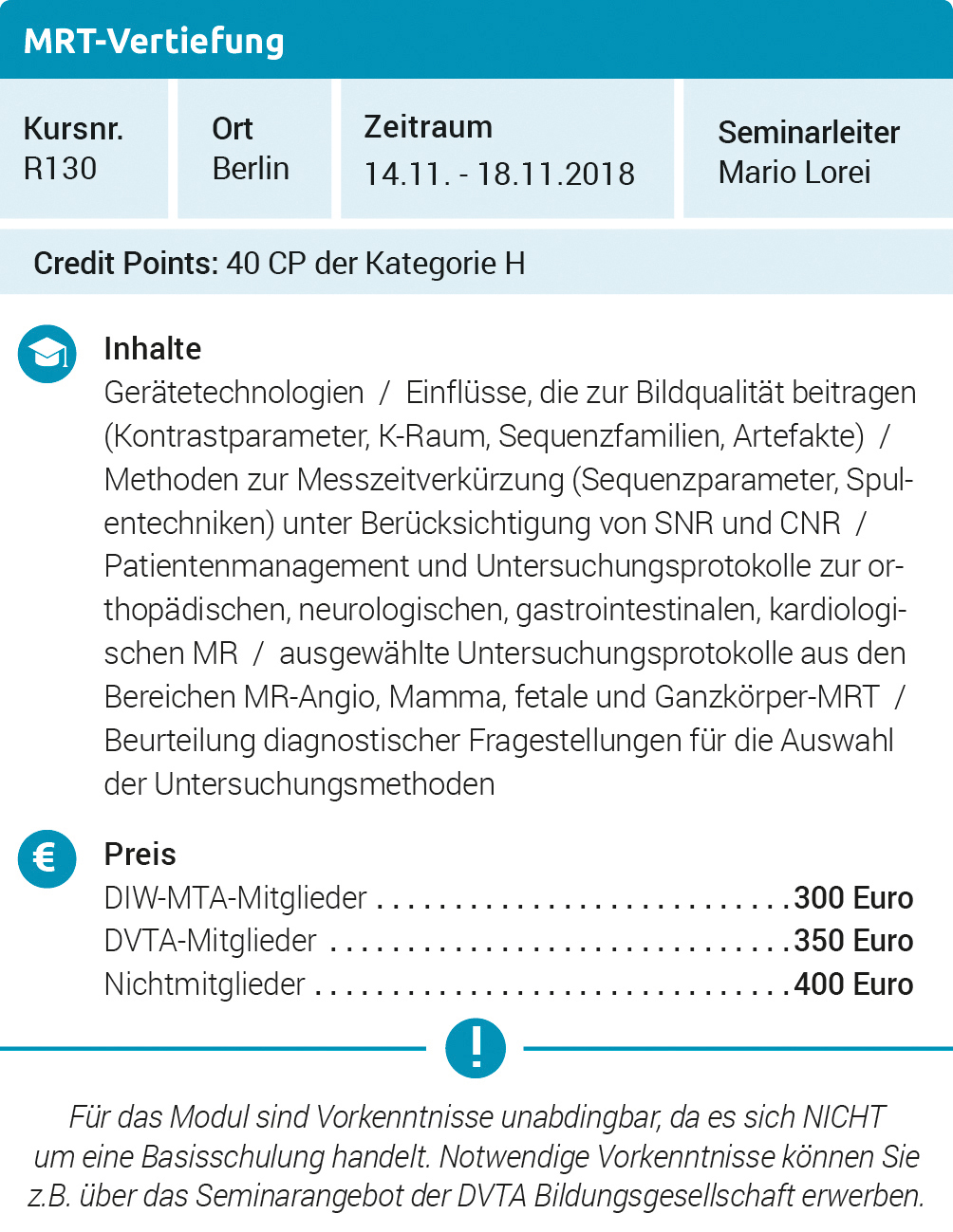 Die Weiterbildung zum „MRT-Sicherheitsexperten“ wird vom DIW-MTA zweimal pro Jahr – mit freundlicher Unterstützung von Prof. Dr. med. Dirk Blondin und OA Thomas Winter – im Elisabeth Krankenhaus Rheydt in Mönchengladbach angeboten und umfasst 30 Seminarstunden sowie eine Prüfungsleistung in Form einer Klausur.