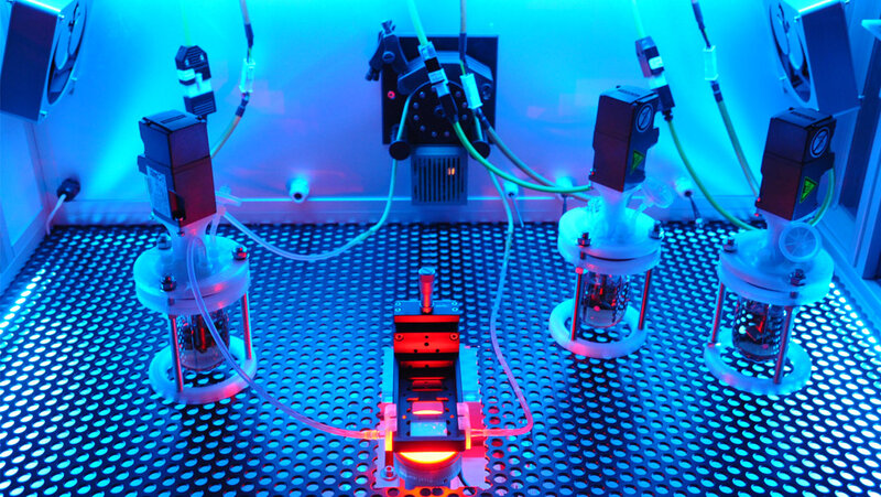Um den wachsenden Bedarf an hiPSCs zu decken und die standardisierte Herstellung in größerer Zahl zu ermöglichen, hat ein Forscherteam des Fraunhofer-Translationszentrums für Regenerative Therapien TLZ-RT am Fraunhofer-Institut für Silicatforschung ISC in Würzburg im Projekt SUSI (kurz für Suspensionsinkubator) einen dynamischen Inkubator und Suspensions-Bioreaktor entwickelt, der sich für die Langzeitkultivierung von hiPSCs eignen soll. Er bietet optimale Bedingungen wie eine Temperatur von 37 Grad C und eine mit fünf Prozent CO2 gesättigte Atmosphäre, die für die Zellkultivierung erforderlich sind. Eine Schlüsselkomponente des Bioreaktors ist der Impeller bzw. Rührer, der die wichtigen Aufgaben des Mischens, der Belüftung sowie des Wärme- und Massentransfers im Glasbehälter zum Einstellen homogener Bedingungen innerhalb der Zellsuspension erfüllt und so eine saubere Zellvermehrung ermöglicht. „Das Wohl der Zellen steht bei uns im Vordergrund. Dementsprechend haben wir die Komponenten unseres Bioreaktors designt und konstruiert“, sagt Thomas Schwarz, Wissenschaftler am Fraunhofer TLZ-RT. So ist es etwa entscheidend, welche Scherkräfte beim Rühren der Kultur auf die Zellen wirken. Mithilfe von Software-Simulationen konnten die Forschenden optimale Parameter für die Konstruktion des Impellers sowie die geeignetsten Prozessparameter berechnen, die dann im Bioreaktor mithilfe von Sensoren kontinuierlich in Echtzeit überwacht werden. Das erziele eine homogene Zellsuspension – auch bei großen Zellmengen. Dementsprechend sei das Glasgefäß, das den Impeller umhaust, skalierbar.