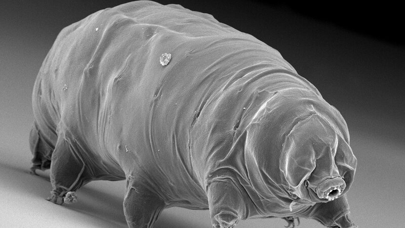 Bärtierchen, auch Wasserbären genannt, gehören zur Familie der Fadenwürmer. Ihr Name rührt daher, dass ihre Gangart an die eines Bären erinnert. Damit wären die Gemeinsamkeiten aber bereits erschöpft. Die nur knapp einen Millimeter großen Bärtierchen haben es geschafft, sich im Laufe der Evolution perfekt an schnell wechselnde Umweltbedingungen anzupassen und können bei extremer Hitze austrocknen und bei Kälte gefrieren. ,,Sie fallen in einen Dornröschenschlaf ohne zu sterben“, erklärt Schill.