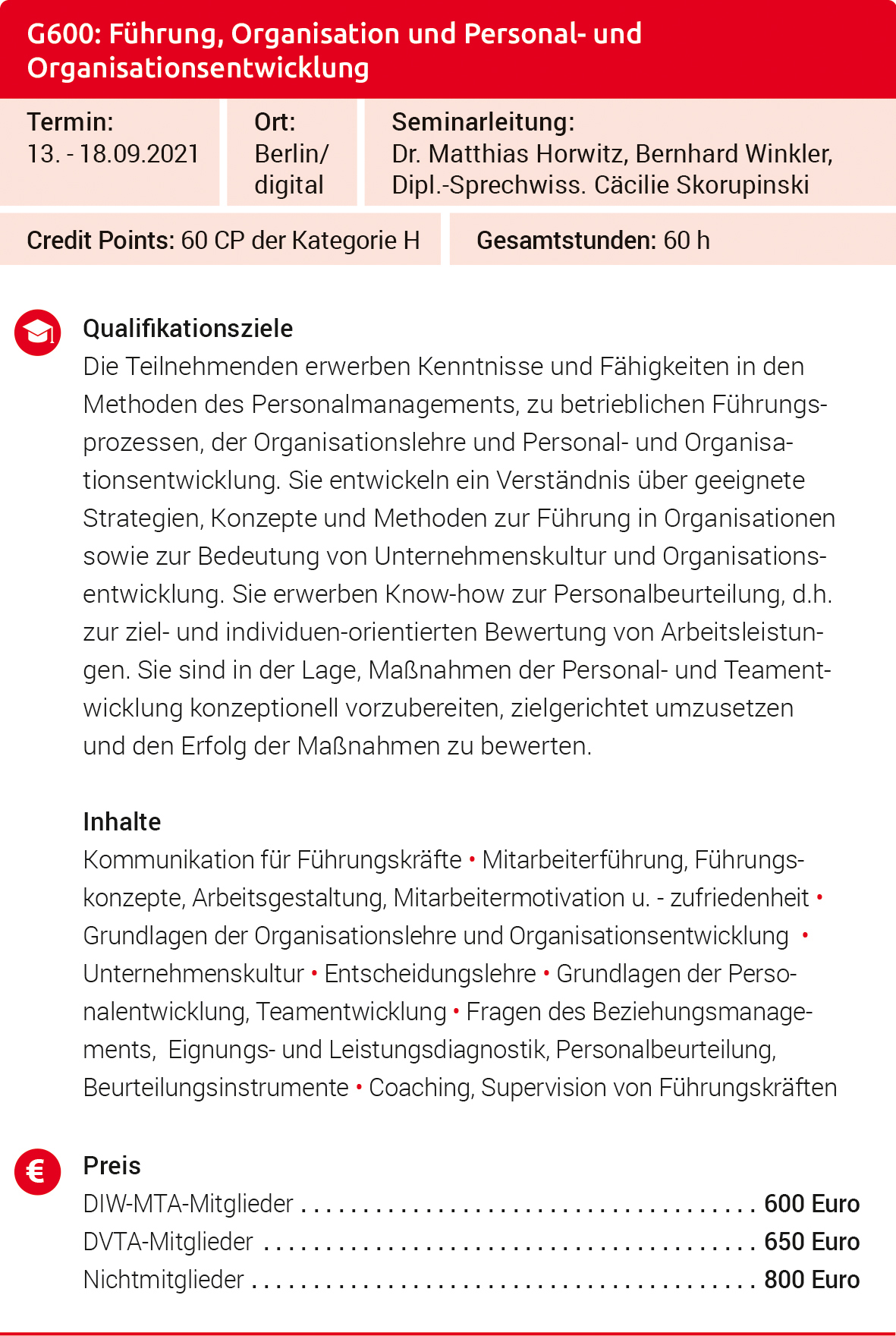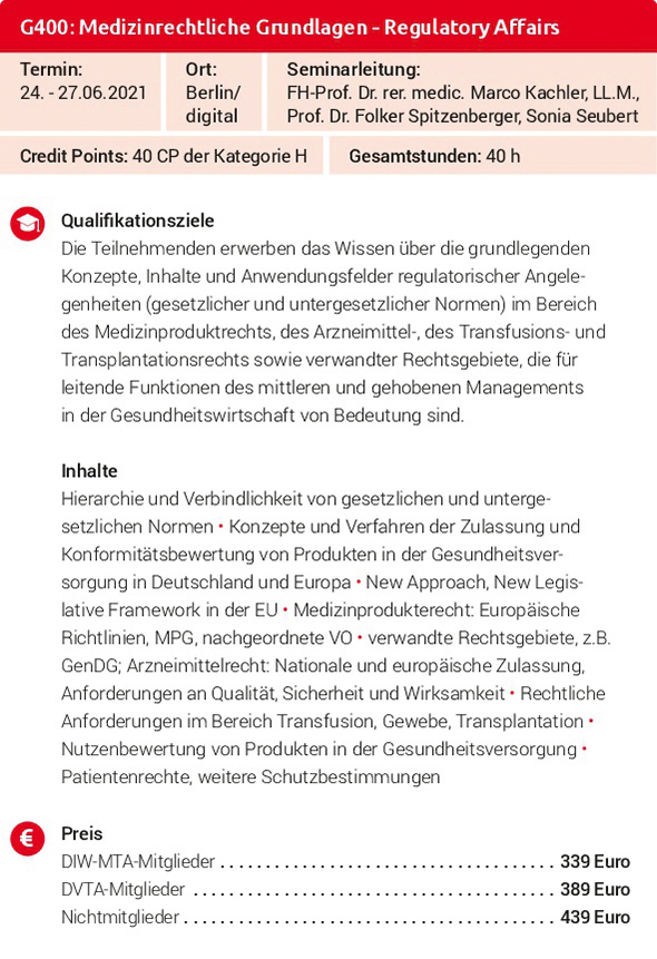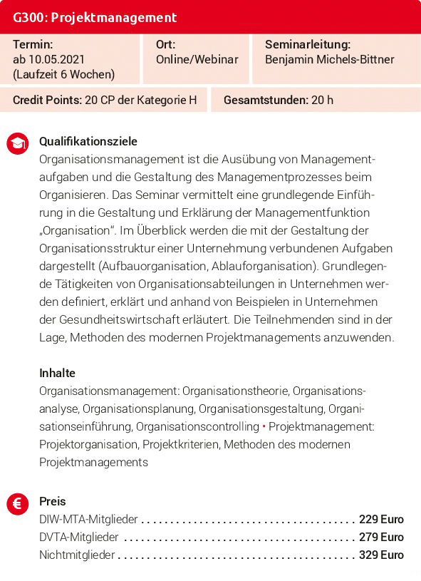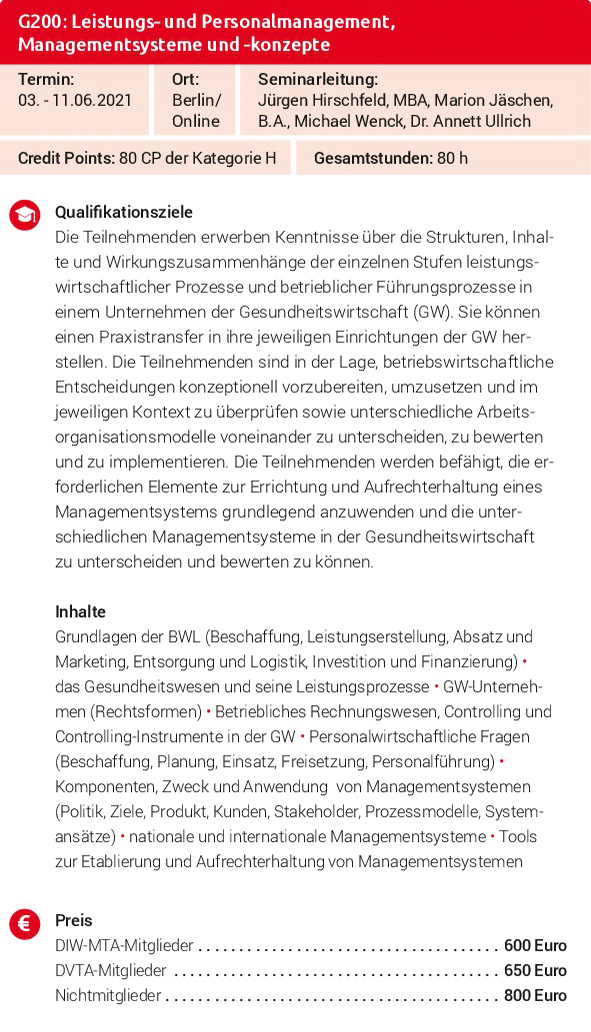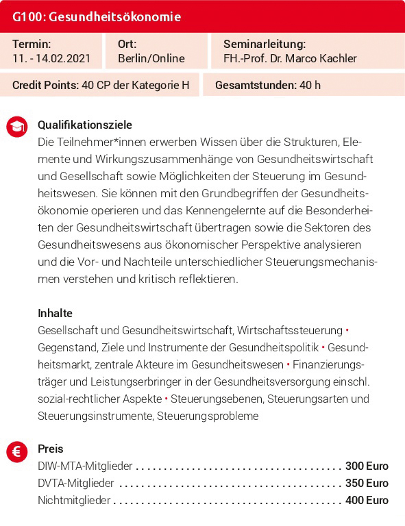Der nun elfte Durchgang der Weiterbildung „Medizinalfachpersonen für Leitende Funktionen“ am DIW-MTA startet im Februar 2021 mit dem Kurs „Gesundheitsökonomie“ ab dem 11. Februar 2021 sowie im Oktober 2021. Bei Fragen zum Einstieg in die berufsbegleitende Weiterbildung wenden Sie sich bitte an die Geschäftsstelle des DIW-MTA unter info@diw-mta.de.