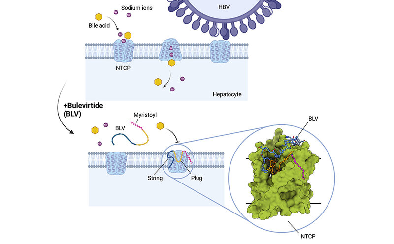 Herauskam, dass Bulevirtide drei wichtige Bereiche bildet: eine Myristoylgruppe, die auf der Zell-Außenseite mit der Zellmembran interagiert; einen sogenannten „plug“, der sich genau in den Transporttunnel von NTCP einfügt wie ein Schlüssel in ein Schloss; und eine Aminosäurekette, die sich über die Oberfläche des Rezeptors erstreckt und ihn wie eine Klammer umschließt. „Die Ausbildung eines ‚plugs‘ im Transporttunnel und die damit verbundene Inaktivierung des Gallensalztransporters ist bislang einzigartig unter allen bekannten Virus-Rezeptor-Komplexen. Diese Struktur erklärt, warum die physiologische Funktion des NTCP bei der Behandlung von Patienten und Patientinnen mit Bulevirtide gehemmt wird“, erläutert Prof. Stephan Urban, DZIF-Professor und stellvertretender Koordinator des Forschungsbereichs Hepatitis, in dem Bulevirtide entwickelt wurde.