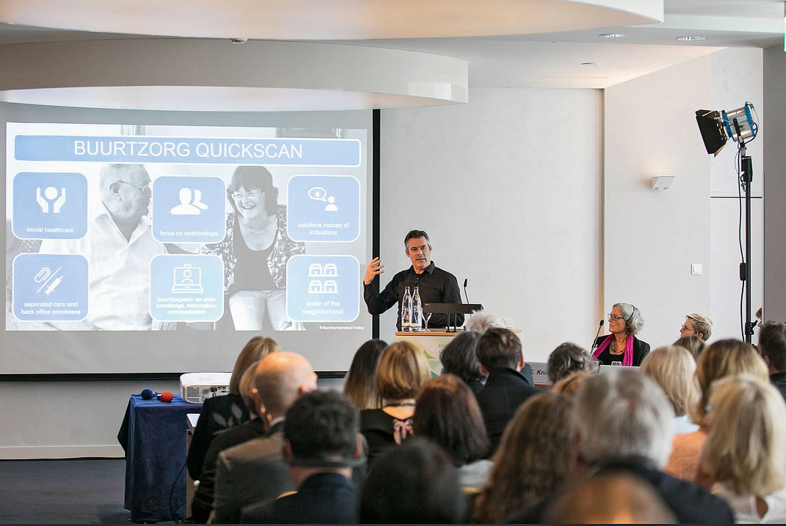 De Blok hat die Versorgung von Pflegebedürftigen unter dem Motto „Keep it small – keep it simple“ grundlegend geändert. Er berichtete, dass zunächst die Patienten dahingehend befragt werden, wie sie selbst dazu beitragen können, ihre Unabhängigkeit zu erhalten oder wiederzuerlangen. Beim zweiten Schritt geht es dann um die Nachbarschaft (Buurtzorg). Familienangehörige, Nachbarn und Freunde werden in die Betreuung miteinbezogen. Der nächste Schritt umfasst die tatsächlichen pflegefachlichen Tätigkeiten, die vom zuständigen Buurtzorg-Team geleistet werden. Als vierter Schritt erfolgt der Aufbau, die Pflege und die Koordination eines stabilen verlässlichen formalen Netzwerkes bestehend aus Hausarzt, Spezialisten (zum Beispiel Physiotherapeuten), Apotheke, Krankenhaus sowie gegebenenfalls anderen lokalen und überregionalen Diensten (beispielsweise Dialyse), die Patienten in Anspruch nehmen. Damit die Patienten nicht überfordert werden, stehen ihnen maximal zwei Pflegekräfte für alle Aktivitäten zur Verfügung, die rund um die Uhr erreichbar sind. Die Pflegeteams kennen die Patienten und Pflegetouren in ihrem Einzugsgebiet und können sich gegenseitig vertreten. Auf diese Weise entsteht für alle Patienten ein Netzwerk von Helfern und Helferinnen, auf das sie sich verlassen können und das zugleich Angehörige entlastet. Dabei wird ein ständiger Wechsel der Pflegekräfte vermieden, was auf beiden Seiten zu Sicherheit und Vertrauen führt. Ein wichtiger Faktor des Erfolgs ist, so de Blok, die weitgehende Eigenverantwortlichkeit der Pflegeteams, die aus hochqualifizierten Fachkräften, oft sogar mit Bachelorabschluss, bestehen. Diese selbstständigen Gruppen von bis zu zwölf Pflegekräften sind verantwortlich für die Organisation des gesamten Pflegeprozesses. „Es gibt bei uns keine Hierarchien und keine Vorgesetzten“, betont de Blok. Die Teams arbeiten außerdem ortsgebunden, um lange Fahrten zu vermeiden. Der Kern der Arbeitsweise: Die Pflegekräfte kalkulieren gemeinsam mit dem Patienten, wie viel Zeit nötig ist, damit er gut versorgt ist. Abgerechnet wird stundenweise, nicht nach Einzelleistungen. Es war de Blok außerdem wichtig, den bürokratischen Aufwand soweit wie möglich zu minimieren. Deshalb nutzen die Teams die soziale Netzwerkplattform von buurtzorgweb, ein IT-System, das von der Organisation zusammen mit Pflegekräften entwickelt wurde. Jede Pflegekraft hat ein Tablet zur Verfügung, auf dem der Pflegeprozess dokumentiert wird. „Bei uns sind 50 Mitarbeiter, darunter 21 Coaches, aber null Manager in der Zentrale tätig. Die Zentrale kümmert sich um die unvermeidliche Bürokratie, sodass das Pflegepersonal damit nicht behelligt werden muss.“