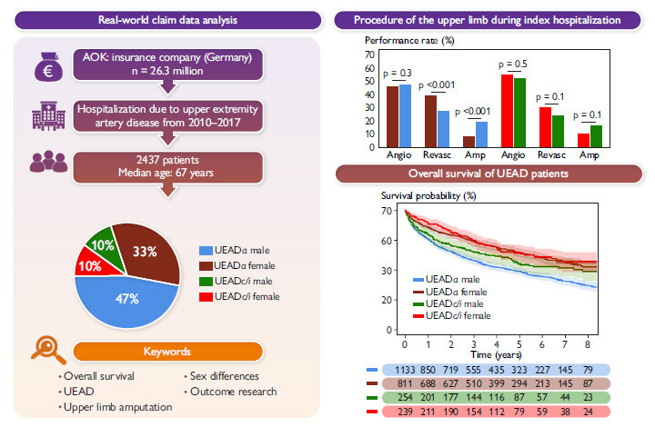 Ein Studien-Team aus Münster hat deshalb im Rahmen des GenderVasc Projektes - ein vom Gemeinsamen Bundesausschuss gefördertes Projekt - die Prävalenz, das therapeutische Management sowie die Langzeit-Prognose hinsichtlich Amputation und Mortalität der UEAD untersucht und veröffentlicht. Die Autoren der Studie haben für die Analyse Daten aller stationär behandelten Patientinnen und Patienten mit der Hauptdiagnose UEAD der AOK Krankenkasse aus den Jahren 2010 bis 2017 einbezogen (n = 2.437). Obwohl Patientinnen und Patienten mit einer UEAD im Vergleich zu Betroffenen mit einer LEAD im Rutherford Stadium 4-6 (chronic limb threatening ischemia; CLTI) zehn Jahre jünger waren, litten sie häufiger an zusätzlichen kardiovaskulären Komorbiditäten wie Diabetes mellitus, Hypertonie, aktiver Raucherstatus, chronische Herzinsuffizienz oder chronische Nierenerkrankung und/oder entzündlichen Erkrankungen wie Raynaud Syndrom, rheumatoide Arthritis, Thromangitis obliterans oder Sjörgen Syndrom. Im Verlauf von 30 Tagen erlitten 15% der UEAD-Patientinnen und Patienten eine Amputation der oberen Extremität. Die Amputationsrate stieg nach einem Jahr auf 20% und erreichte hier ein Plateau, wobei die Mortalitätsrate während der Beobachtungsphase stetig anstieg und nach fünf Jahren bei 45% lag. Bemerkenswert war, dass sowohl die Amputations- als auch die Mortalitätsrate bei Männern höher war als bei Frauen.