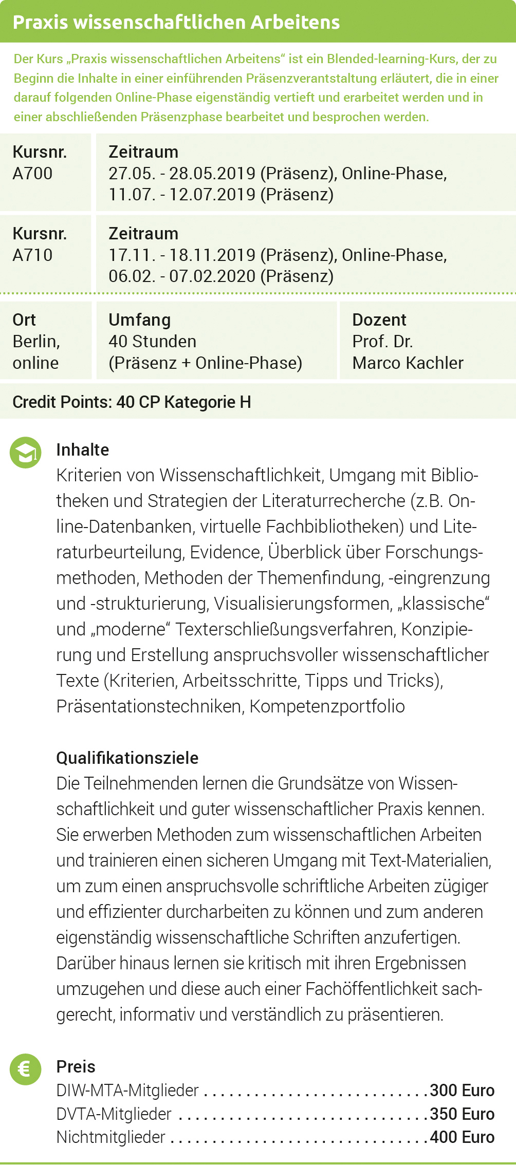 •    Präsenzlernphasen (zum Beispiel in Form von Seminaren, Vorlesungen oder Workshops) und Elemente, die ein elektronisches Lernen in Distanz ermöglichen (jegliche E-Learning-Elemente wie Online-Lernplattformen, virtuelle Klassenzimmer [zum Beispiel ein virtueller Audiochat])