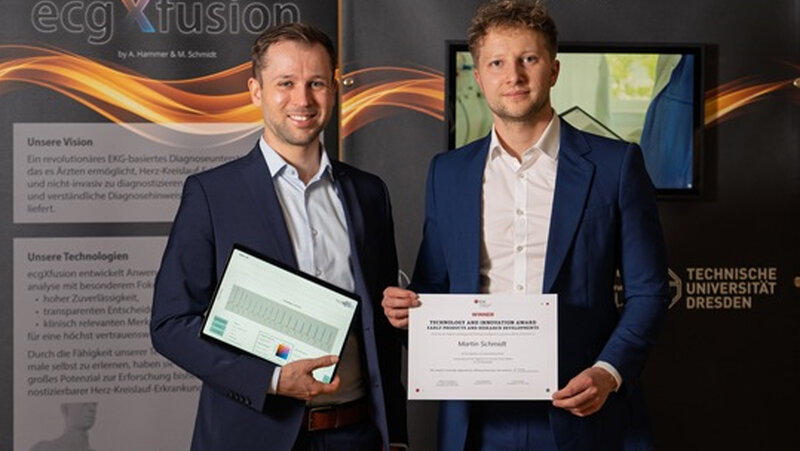 Das Forscherteam um Dr. Martin Schmidt und Alexander Hammer vom Institut für Biomedizinische Technik (IBMT) der TU Dresden bekam auf dem ESC Digital & AI Summit 2025 den Award. Mit „ecgXfusion®“ hat das Dresdner Team ein KI-basiertes Diagnoseunterstützungssystem entwickelt, das bei der präzisen, nicht-invasiven Erkennung von Herz-Kreislauf-Erkrankungen helfen kann. Die vom Forscherteam entwickelte Technologie, die in drei Patenten der TU Dresden beschrieben ist, kombiniert modernste Methoden der erklärbaren künstlichen Intelligenz (XAI) mit einer robusten Analyse von EKG-Signalen. Sie soll nachvollziehbare Hinweise für die medizinische Diagnostik liefern und transparente Entscheidungsgrundlagen schaffen, sowohl für die klinische Praxis als auch für die Forschung.