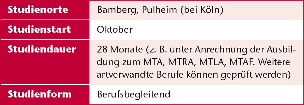 Der Studiengang Medical Technology & Management setzt genau dort an und vermittelt medizinische, naturwissenschaftliche, technische und mechanische Grundlagen für die benötigte Weiterbildung. Die Integration von Medizin, Technik, IT und Wirtschaft gibt dem Studiengang B.A. Medical Technology & Management branchenübergreifend eine hohe Relevanz. Fast jeder Patient oder Sportler ist in unterschiedlichem Umfang auf medizintechnische Produkte und Verfahren angewiesen, sei es eine orthopädische Einlage, MRT-Diagnostik, Laboruntersuchung, Belastungsdiagnostik mittels EKG oder auch aufwendige Hörgeräte. Der Umgang, die Entwicklung sowie die Vermarktung dieser teils hochkomplexen Geräte stehen im Fokus des Studiengangs. Durch Verknüpfung und Berücksichtigung von technischen Entwicklungen in den Feldern Orthopädie, Rehabilitation und Sport, Radiologie-, Funktions- und Labortechnologie und akustische, dentale sowie optische Technologie wird die Aktualität des Lehrangebots sichergestellt. Es gilt, die steigende Bedeutung der Interaktion von Mensch und Maschine/Gerät in der Diagnostik und Therapie im Rahmen der akademischen Qualifikation umzusetzen sowie Fach- und Führungskräfte in der technologisch geprägten Medizinindustrie in den Bereichen Fertigungs- und Verfahrenstechnik, Materialkonzeption oder Gerätedesign auszubilden. Medizinische, technologische und wirtschaftliche Kenntnisse werden dabei umfassend zusammengebracht. Der Schwerpunkt liegt auf der Bearbeitung von Aufgabenstellungen, die durch den gemeinsamen Beitrag von Wirtschaft, Medizin, Technik und Sport umfassend gelöst werden können. Interdisziplinäre Denkweisen und der Umgang mit der Digitalisierung sollen durch die Kombination von Modulen wie Datenmanagement & Datenanalyse, medizinische Diagnostik und Technologie, Grundlagen technischer Anwendungen, Wirtschafts- und Medizinrecht oder auch Unternehmensführung genauso geschult werden wie wirtschaftliches Denken und Handeln. Das berufsbegleitende Studium bietet Studierenden dabei die Möglichkeit, einen akademischen Abschluss zu erwerben und gleichzeitig dem eigenen Job vollumfänglich nachzukommen. Ziel des Studienmodells ist es, Beruf, Familie und Vorlesungen zeitlich in Einklang zu bringen. Den Kliniken und Institutionen in der Gesundheitstechnologie bietet das Modell die Chance, Mitarbeitern eine Weiterentwicklungsmöglichkeit innerhalb der Organisation anzubieten. Die Besonderheit des Studiengangs besteht darin, dass die Inhalte der Ausbildung anteilig auf das Studium angerechnet werden können. Dadurch reduziert sich die Studienzeit erheblich. Zielgruppe des Studiengangs sind hier MTA (MTRA, MTAF, MTLA) und weitere technisch orientierte Gesundheitsfachberufe (wie zum Beispiel PTA, CTA, ATA, OTA Orthopädietechnik/-mechaniker, Assistent für Gerätetechnik, Optiker, Zahntechniker, Hörgeräteakustiker). Die späteren Einsatzbereiche nach dem Studium sind vielfältig: Von Entwicklung, Vertrieb und Betreuung von medizintechnischen Geräten der Diagnostik und Rehabilitation über die Durchführung von Forschungsprojekten bis hin zur (technischen) Leitung von Laboren, Praxen, Sportkliniken, Sanitätshäusern oder auch Rehabilitationszentren stehen viele Wege offen.