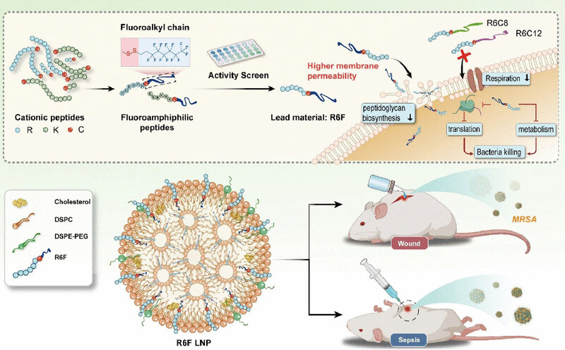 Am wirksamsten erwies sich das Lipopeptid „R6F“, bestehend aus Arginin-Bausteinen und einer Lipidkette (acht Kohlenstoff- und 13 Fluoratome). Um die Biokompatibilität weiter zu erhöhen, banden die Forschenden R6F in Phospholipid-Nanopartikel ein. Im Mausmodell ließen sich die vorherigen positiven Ergebnisse bestätigen. R6F zeigte sich sehr wirksam gegen Blutvergiftungen und chronische Wundinfektionen durch MRSA – ohne toxische Nebenwirkungen.
