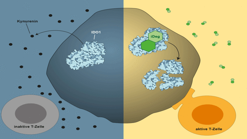Immuntherapien mit Checkpoint-Hemmern lösen gezielt die krebsschützenden „Bremsen“ im Immunsystem und werden bereits zur Behandlung vieler Tumorarten wie dem schwarzen Hautkrebs, Lungen-, Darm- und Brustkrebs eingesetzt. Diese Immuntherapien wirken jedoch nur bei einem Teil der Betroffenen, und nicht selten entwickeln sich auch Resistenzen. Präklinische Studien haben gezeigt, dass sich die Wirkung von Checkpoint-Hemmern deutlich verbessert, wenn man sie zusammen mit Hemmern des immunmodulierenden Enzyms Indolamin-2,3-Dioxygenase (IDO1) einsetzt. Während IDO1 im normalen Gewebe kaum vorkommt, liegt es im Tumor in hohen Mengen vor. Dort verstoffwechselt es die Aminosäure Tryptophan in Kynurenin, was zahlreiche negative Effekte auf die Immunantwort hat, wie zum Beispiel die Reduktion der Menge und Aktivität der T-Killerzellen.