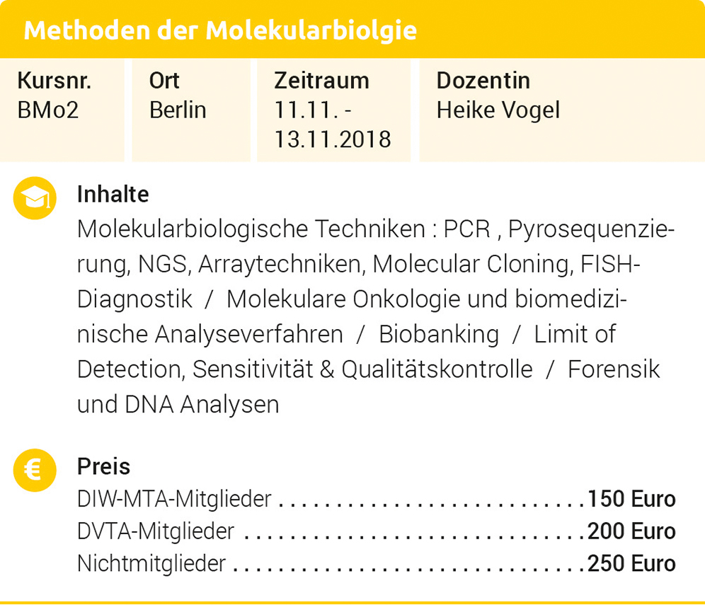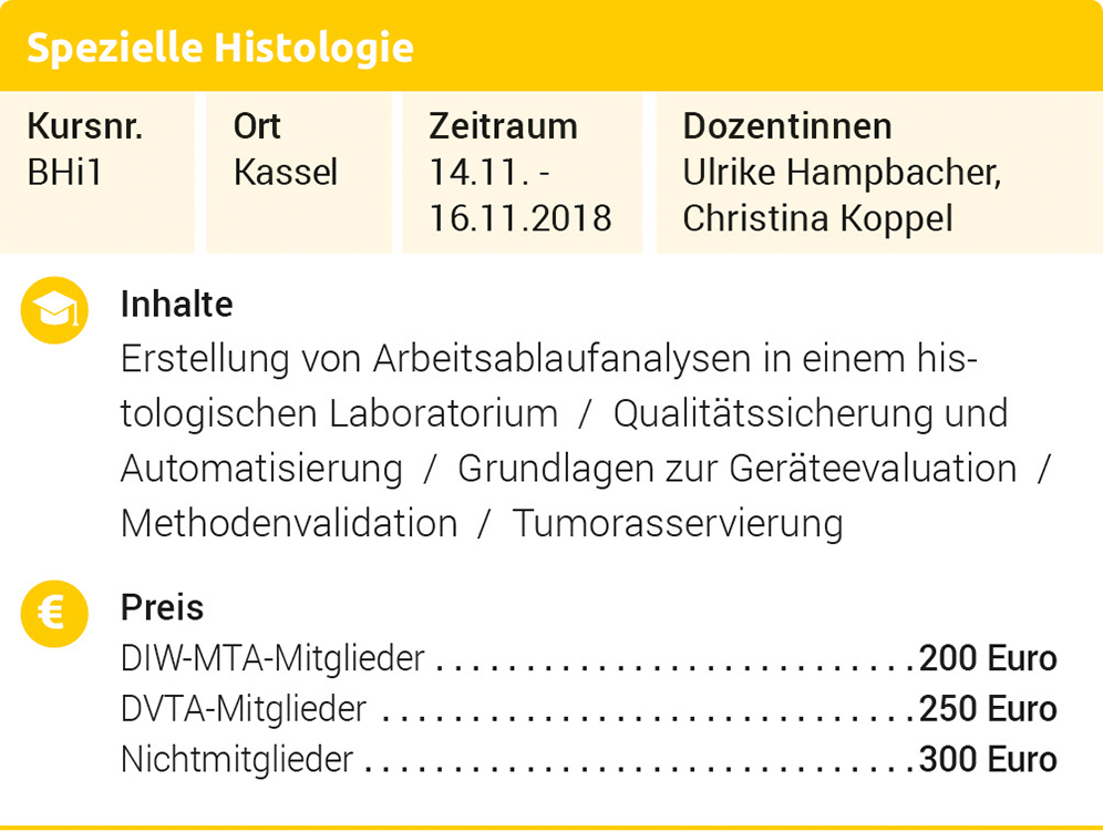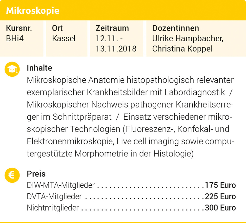 Im Vordergrund einer individualisierten Behandlung als vielversprechende Alternative zu herkömmlichen Verfahren steht jedoch die Entwicklung von Modellen, die dazu geeignet sind, komplexe multizelluläre Strukturen von Tumoren abzubilden. Das erfordert das Verstehen der inhaltlichen Komplexität und ein Miteinander der am Entwicklungs- und Arbeitsprozess beteiligten Professionen auf fachlich hohem Niveau. Das DIW-MTA bietet in seinem aktuellen Jahresprogramm wieder Fachqualifikationen im Fach Histologie an, die auch als Einzelseminare belegt werden können. Nach erfolgreichem Abschluss verfügen die Teilnehmer/-innen, angeleitet durch hochkompetente Fachpraktikerinnen, über ein umfangreiches Wissen zu den verschiedenen Gewebearten des menschlichen Körpers, deren wichtigsten pathologischen Veränderungen sowie vertiefter Kenntnisse der Gewebeverarbeitung. Histochemische, immun- und enzymhistochemische Analysemethoden und Applikationen können anschließend im Arbeitsalltag eigenverantwortlich geplant, durchgeführt, beurteilt sowie validiert und evaluiert werden. Eine Erweiterung fachlicher Kompetenzen, deren Verstehen vielleicht sogar einer Hinwendung zu neuen Arbeitsfeldern zuträglich sein könnte, um den vormalig als „Orchideenfach“ geltenden Arbeitsbereich „Histologie/Histopathologie“ mit neuem, spannenden Leben zu füllen. Weitere Informationen unter www.diw-mta.de.