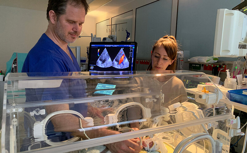 Gemeinsam mit Forschenden der ETH Zürich haben die Neonatologen der KUNO Klinik St. Hedwig ein Computermodell entwickelt, dass die Diagnose bei Neugeborenen zuverlässig unterstützt. Hierfür haben die Forschenden den Algorithmus trainiert – mit Herz-Ultraschalluntersuchungen von 192 Neugeborenen sowie der gestellten Diagnose: pulmonale Hypertonie vorhanden oder nicht und die Einschätzung des Schweregrads in „mild“ oder „moderat bis schwer“. Anhand der bereits gezeigten Ultraschallbilder und einem neuen Datensatz von 78 Neugeborenen wurde die Genauigkeit des Algorithmus in der Diagnose überprüft. In 80 bis 90 Prozent der Fälle lag die KI richtig in der Diagnose und bei 65 bis 85 Prozent stimmte auch der Schweregrad.